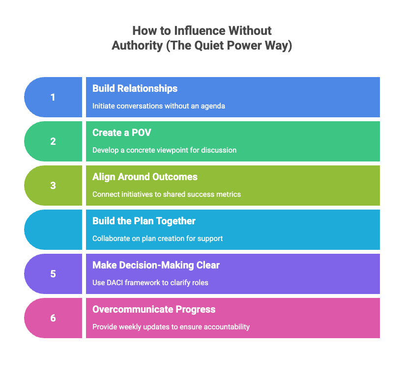 One of my mentees, a senior product manager at a growth-stage startup, used this framework to drive adoption of a new customer research process across five different teams. She had zero formal authority over any of them, but by the end of the quarter, they were asking her to expand the program. The secret? She made their jobs easier and kept everyone informed along the way.